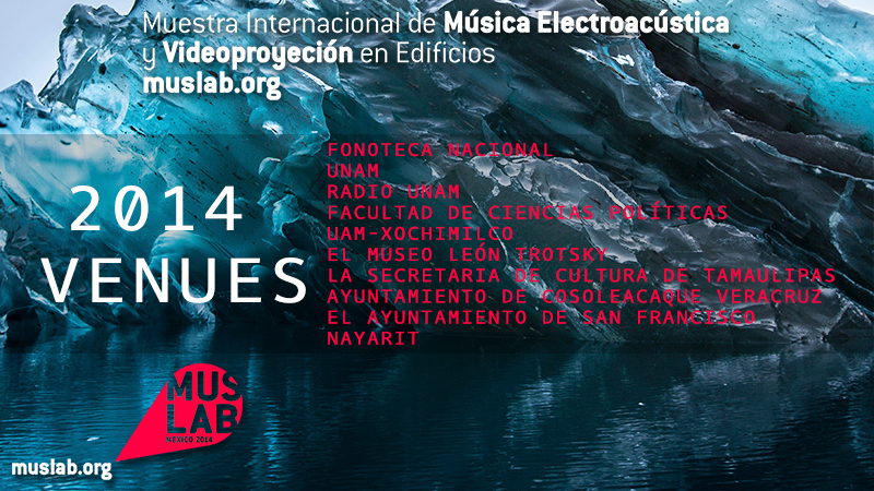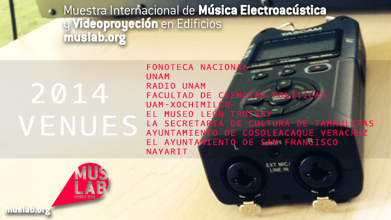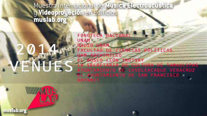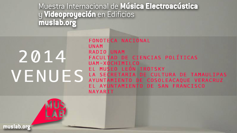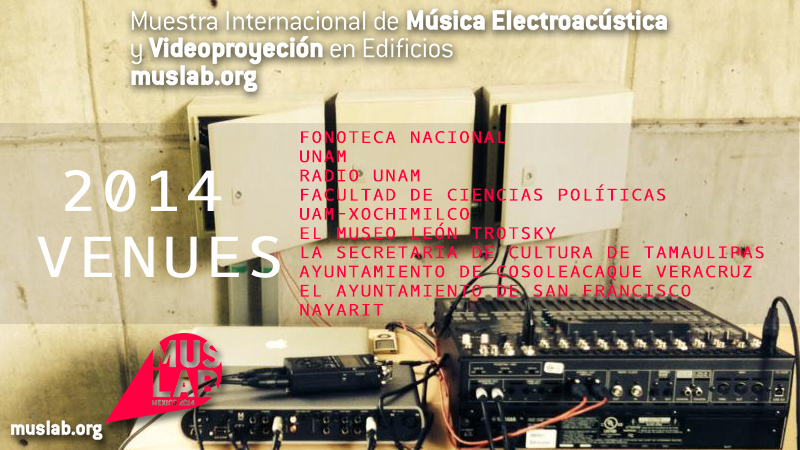 MUSLAB 2014 tuvo como sedes  Fonoteca Nacional UNAM, Radio UNAM, Facultad de ciencias Políticas, UAM-X, El museo León Trotsky, la Secretaria de Cultura de Tamaulipas, Ayuntamiento de Cosoleacaque Veracruz, y por el Ayuntamiento de San Francisco, Nayarit y diferentes asociaciones y colectivos artísticos.