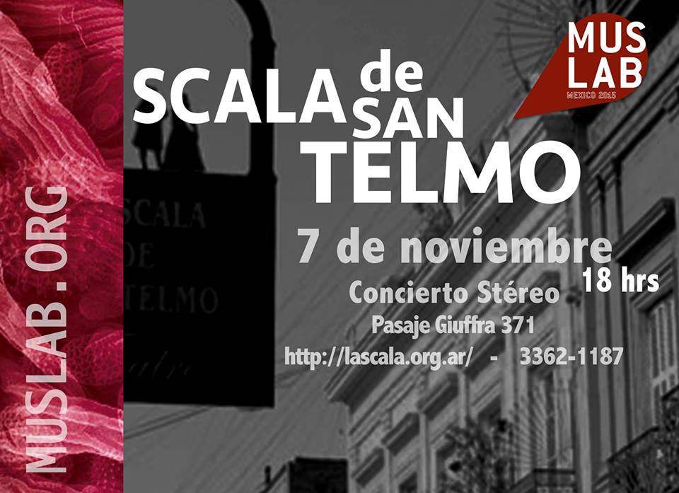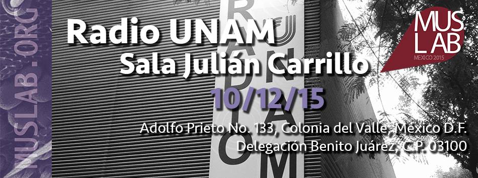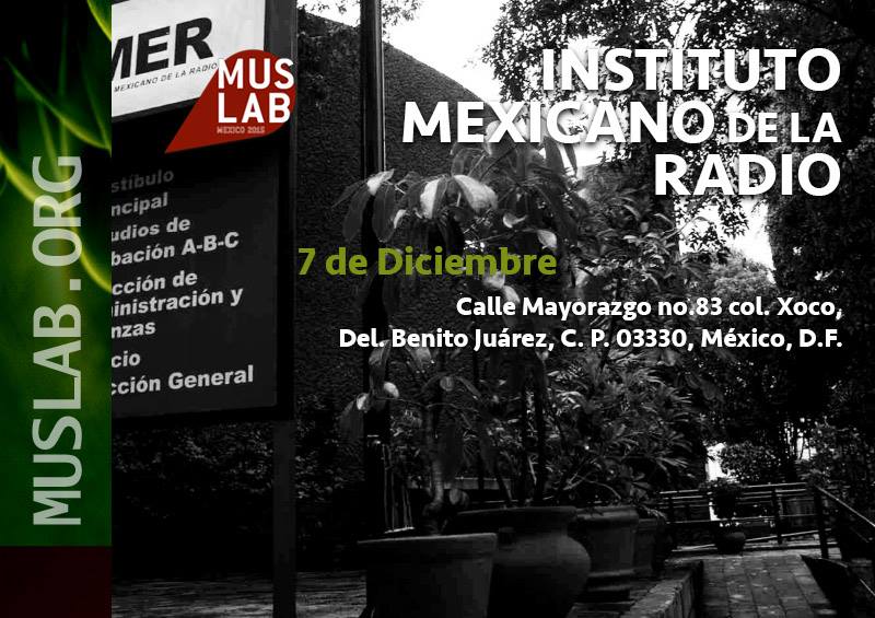 MUSLAB 2015 tuvo como sedes: México: Radio UNAM, UAM-Xochimilco, IMER, Centro Cultural de España, Francia: CESARECentre national de création musicale Reims, Conservatorio de Música de Reims, Argentina: Fundación Beethoven, Centro Cultural La Abadia, Brasil: Universidad Federlale de Rio de Janeiro URFJ, Estudio FitaCrepe Sao Paulo, Inglaterra: Coventry University, Chealse University.
